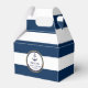 Love these personalised favour boxes for your nautical wedding favour gifts! Navy blue and white stripes with navy blue anchor and rope. Gold foil circle to add some touch of class. Add your text and customise it! Get matching invites and stickers! Found in 'NAUTICAL' wedding collection.