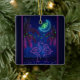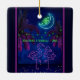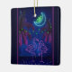 This tropical beach Christmas tree ornament features two Pink Neon Flamingos in Love under a Neon Moon. They are surrounded by palm trees decorated with green neon string lights. The back can be personalised with names, a year or any text that you wish to add. -