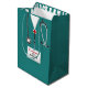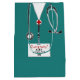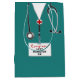 Creative nurse graduation gift bag design featuring teal hospital scrubs, stethoscope, and a big congrats. Edit text to add nursing school grad's name.