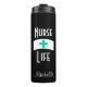 Customisable black background with white and turquoise teal nurse's hat and medical cross on front of tumbler and "Nurse Life" in white typography