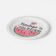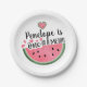A cute one in a melon themed watercolor watermelon personalised birthday paper plates. Add your child's name. see the full collection of products for this design at: https://www.zazzle.com/collections/one_in_a_melon_baby_kids_birthday_party-119209815727560938