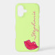 A pair of shining red lips with a a little sparkle and a purple and yellow outline. Subtle white highlights give it a shiny look. Personalise with your own name. pale lime green background.