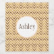 Modern and trendy wine bottle label features customisable centre name text with peach and gold chevron stripe background pattern.
