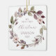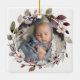 Celebrate baby's first Christmas with this keepsake ornament, featuring a watercolor wreath of purple and green leaves, purple berries and pink flowers. The word "Christmas" appears in delicate purple handwriting script. Personalise the ornament with baby's name and the year in purple sans serif font on one side and your favourite photo on the other.
