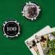 Personalised poker game chips with a custom photo and your own text (family name, established year, etc). This design in black includes the number 100 but it can be edited with any value amount.