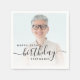 Modern birthday party napkins featuring a custom photo. Easily replace the sample image with a photo of the guest of honour. The word "birthday" appears in elegant black handwriting script. Personalise the text with the name and birthday year in black sans serif font. A white gradient overlay helps make the text pop.