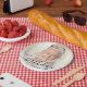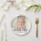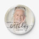 Modern birthday party paper plates featuring a custom photo. Easily replace the sample image with a photo of the guest of honour. The word "birthday" appears in elegant black handwriting script. Personalise the text with the name and birthday year in black sans serif font. A white gradient overlay helps make the text pop.