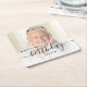 Modern birthday party paper coasters featuring a custom photo. Easily replace the sample image with a photo of the guest of honour. The word "birthday" appears in elegant black handwriting script. Personalise the text with the name and birthday year in black sans serif font. A white gradient overlay helps make the text pop.