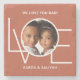 This We Love You Dad Photo Stone Coaster is decorated with the word LOVE in white typography on a rust terracotta background.