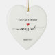 Elegant ceramic heart ornament celebrating a marriage, featuring customisable names, a beautiful script "married" with a red heart accent, personalised photo, names and date. Perfect marriage gift or wedding shower keepsake. Available in white ceramic with gold hanging ribbon.