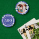 Personalised poker game chips with a custom photo and your own text (family name, established year, etc). This design in purple includes the number 500 but it can be edited with any value amount.