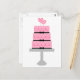 Pink, three-tiered cake with black ribbon and bows; sitting on a silver cake stand with hearts on top