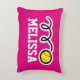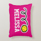 Personalised girls pillow with cute yellow toy softball ball design. Sports theme home decor with name or monogram of child. Cute print with girly colours for baby nursery, childrens bedroom or play room with sofa / couch. Suitable for boys and girls. Customisable background colour ie blue or neon pink. Sporty 1st Birthday gift idea for son, grandson, grandchild, granddaughter, daughter, nephew, etc. Also cool for coach, player and fan. Create your own for team mates or club house decorations. Whymisical illustration.