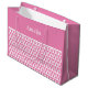 Personalised pink Christmas gift bag design. It has a Scandinavian inspired triangular pattern and the name "Amelia" in white with a hot pink background. It is perfect a perfect addition to your festive gift wrap this holiday season. To add your name, simply type it into the personalise this text box, The colour can also be changed if needed, by simply using the editing tool. If you need help with personalisation, or for a custom design contact me via zazzle chat or email: ursuladawnmoon@gmail.com