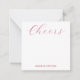 Personalised stationery enclosure notecard with a pink pin stripe pattern in notes of dark deep and vibrant rose pink bubble gum and white with the sentimental words "Cheers". Tuck it into a flower bouquet or meaningful gift. These minimal flower shop inspired enclosure cards bring a retro kitchen vibe to your most thoughtful moments.