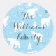 Personalised classic round stickers featuring cute polar bears with falling snowflakes on an ice blue background with the family name in a bluey-grey script font. Perfect for envelope seals and gift labels. Designed by Thisisnotme©