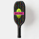 You'll stand out on the Pickleball court with this custom-designed pickleball paddle with this bright;y coloured polka dot pattern on a black background with a pink and blue trimmed band across the centre that has customisable wording on both sides. The front says, "Let's Get Pickled" and the back is personalised with your name. There is an image of a neon green pickleball behind the pink band on both sides. You can also change the background colour to any colour you want by using the EDIT design feature. Email niteowlstudio@gmail.com with any request for changes.
