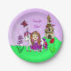 Personalised Princess and Unicorn Birthday Party paper plates with a fairy tale theme.This hand drawn princess has brown hair and a purple dress. She is standing with her friend the unicorn with a rainbow horn and surrounded by a castle, flowers and butterflies.