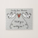 An illustration of 2 beautiful doves holding flowing ribbon with a love heart attached.