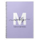 Personalised Elegant Modern Light Purple Script Name Initial Monogram Spiral Notebook. This simple and girly notebook features a soft light purple background with a clean white initial that pairs beautifully with a hand-lettered black script name. Below the initial, the full first and last name is printed in a sleek, modern font, creating a polished and feminine look.