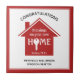 A stylish NEW HOME ceramic tile, designed as a realtor-to-client closing gift. ALL TEXT IS FULLY CUSTOMIZABLE so you can personalise the wording to suit your corporate branding. The text reads CONGRATULATIONS, BLESSINGS ON YOUR NEW HOME with Joshua 24:15 Bible verse - As for me and my house, we will serve the Lord. The image shows a RED house with white typography. The O of HOME is replaced with a key. At the bottom, you can add your name and company name, or personal message to your client (up to three lines recommended). Matching items available so you can create corporate gift sets for your clients. Other colours available.