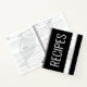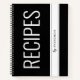 Personalised recipe development notebook in bold and modern black and white editable colour with a large print title of "Recipes by... and your name" printed on the cover in a modern sans serif font.