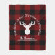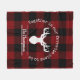 The product design features a silhouette of a deer on a classic red and black buffalo plaid pattern. Combined with your own personalised text, this composition makes a farmhouse country-style, modern, and unique fleece blanket for Christmas, family reunion, or any other special occasions!