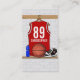 Personalised Red and white basketball jersey hanging in a locker room with a basketball , basketball sneakers and a drinks bottle. The jersey is customisable with your own numbers and name, to create truly unique business cards for the Basketball player or basketball fan. If you require a different colour combination contact us via the store prior to purchase. sgb01