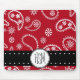 A country western red paisley bandanna pattern with white flowers or snowflakes dotted on a red background. A coordinating dotted black ribbon style band was added horizontally, and then a double ringed white circle where you can add your monogram, initials or short name to create a unique, custom gift item for anyone on your list. Choose from dozens of fun fonts, and reposition or resize as necessary by clicking the handy customise button.