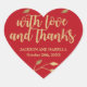 Send your guests home with delicious wedding cake in a beautiful box sealed with this gold and red sticker. Gold text and floral accents create a very sophisticated and elegant statement while still being young and cool. With love and thanks is written in a modern and trendy handwritten script font. The bride and groom names are written below and their wedding date. The simple and minimalist font looks beautiful with the fancy script above. Slender gold branches with delicate leaves decorate the top and bottom of the sticker.