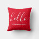 Welcome guests with a warm and stylish touch using this personalised throw pillow. Featuring a modern script "hello" and customisable family name, this red pillow complements various home decor styles. Perfect for adding a personal touch to your living room or bedroom.