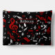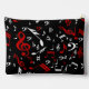Perfect gift for the music lover or musician with a design featuring a random jumbled pattern of musical notes and treble clefs in red and white on a classical black background. Easy to customise with your own text on a coordinating accent.