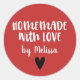 A personalised "homemade with love" sticker on a red coloured background. Make it yours by adding your own name. A pretty finishing touch for all of your handmade gifts. Designed for you by Blackberry Boulevard.