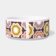This ceramic dog food bowl has some vintage / retro flowers that are gold, pink, purple, and white in the background. In the middle, there is a large white bone with an easily customised name of your doggie written in purple.