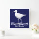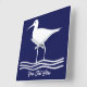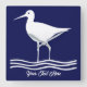 Personalised retro sea bird square wall clock. Sea bird on shore with a text field at bottom centre. Blue and white.