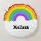 This round shaped pillow or cushion is ready to be personalised with your name or other text. It features an illustration of retro style rainbow in bright colours with your name in bold black lettering in the white clouds.