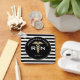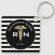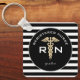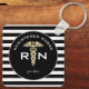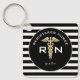 Personalised RN Nurse Modern Black Gold keychain makes the perfect nurse gift idea. It is designed with a caduceus symbol and "RN" on the centre. The background is black and white stripes. Customised with name and has white trendy handwritten script lettering.