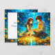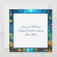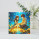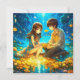 Personalised anime girl and boy on a romantic night Valentine's Day card. Pretty blue and gold flowers and water reflection.
