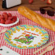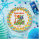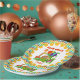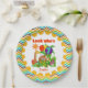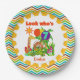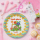 Kids turning seven years old who love animals, especially safari or zoo animals will love these colourful safari theme birthday paper plates that feature jungle plants and trees, a giraffe, lion, birthday balloons, sun, text that reads Look Who's 7, a border of blue, green, orange, brown, and white chevron stripes, and a yellow decorative ring! You can easily add your child's name to personalise these safari 7th birthday paper plates!