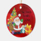 Red bokeh Christmas ornament with Santa Claus placing gifts under the Christmas tree. Personalise with your family name and year, or any text you choose. Add you own photos and text to the back, which has been left undesigned.