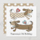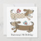A pattern of cute little sausage dogs happily running along with a heart balloon tied to their tails.