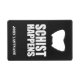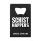 This geology-themed bottle opener features the classic, corny phrase "Schist Happens," a pun variation on another common saying. The design is in bold, white block letters on a black background. Below that is a space for your name or short message!
