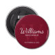 This bottle opener features personalised groomsman's name in white classic script font style with wedding details in white classic serif font style and monogram in light burgundy red classic serif font style as background, on burgundy red background.