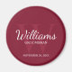 This magnet features personalised groomsman's name in white classic script font style with wedding details in white classic serif font style and monogram in light burgundy red classic serif font style as background, on burgundy red background.