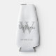 This bottle cooler features personalised groomsman's name in grey classic script font style with wedding details in grey classic serif font style and monogram in light grey classic serif font style as background, on white background.