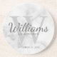 This coaster features personalised groomsman's name in grey classic script font style with wedding details in grey classic serif font style and monogram in light grey classic serif font style as background, on white marble background.