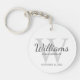 This keychain features personalised groomsman's name in grey classic script font style with wedding details in grey classic serif font style and monogram in light grey classic serif font style as background, on white background.