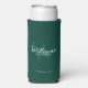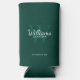 This can cooler features personalised groomsman's name in white classic script font style with wedding details in white classic serif font style and monogram in light emerald green classic serif font style as background, on emerald green background.