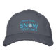 A Personalised Snow Embroidered Snowflake on Baby Blue embroidery. Easily edit the two text fields you see on this product page with your name or any text you like. This embroidered baseball cap is a great last minute gift for yourself or for someone special on your Winter Season list.