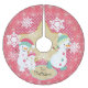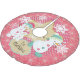 Three snowmen of various sizes with pink and blue winter hats, one wearing ice skates, a pink background with white polka dots and snowflakes of white with a banner you can easily personalise with your family name on a holiday tree skirt you're sure to love for years to come!